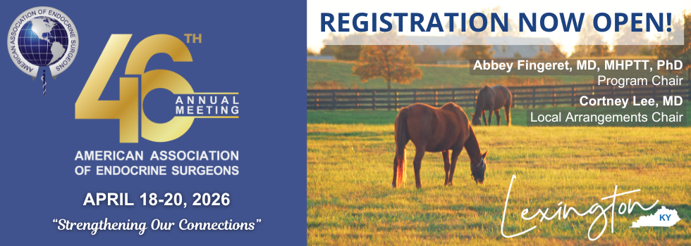 Register Now for the AAES 2026 Annual Meeting - join us in the Horse Capital of the World®!The American Association of Endocrine Surgeons 46th Annual Meeting will take place April 18-20, 2026 in Lexington, Kentucky. Learn more about the Annual Meeting, the program, speakers, sponsors, things to do in Lexington and more! Registration and the AAES hotel block is now open! Early-bird rates apply through February 1, 2026. View the 2026 Meeting Website
